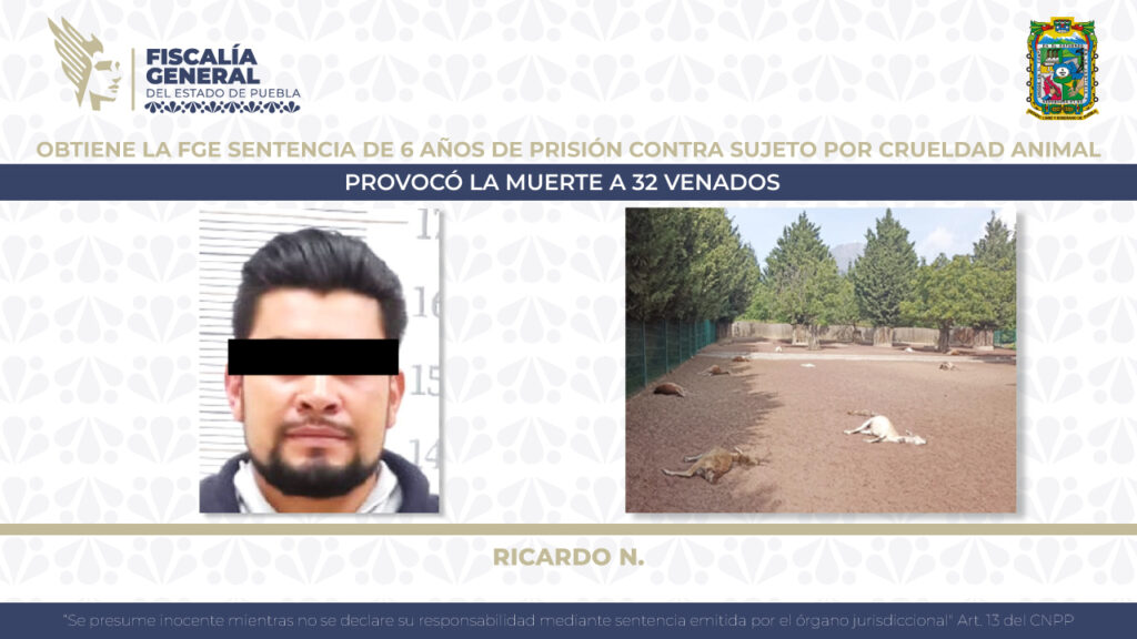 La Fiscalía General del Estado de Puebla informa que obtuvo una sentencia de seis años de prisión por delitos cometidos contra animales, en su modalidad de crueldad, en contra de un sujeto que provocó la muerte a 32 venados que habitaban en un parque ubicado en Chalchicomula de Sesma.