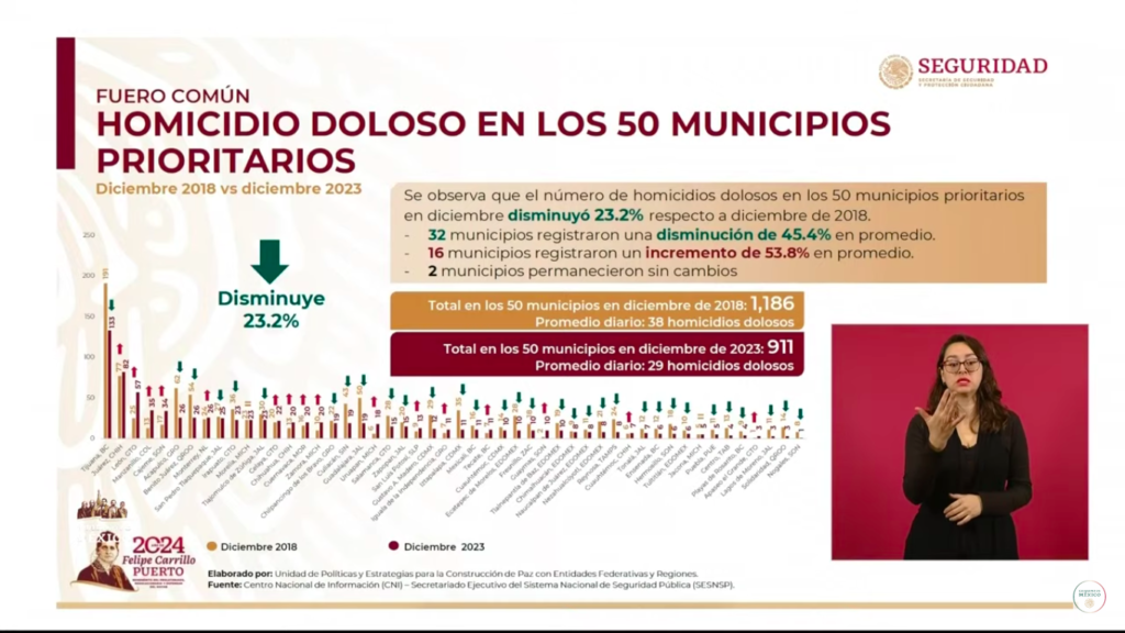 La titular de la SSPC, Rosa Icela Rodríguez presentó un balance en materia de seguridad, donde destacó que durante diciembre del año pasado hubo una disminución de 23.2% en los asesinatos, en los 50 municipios prioritarios.