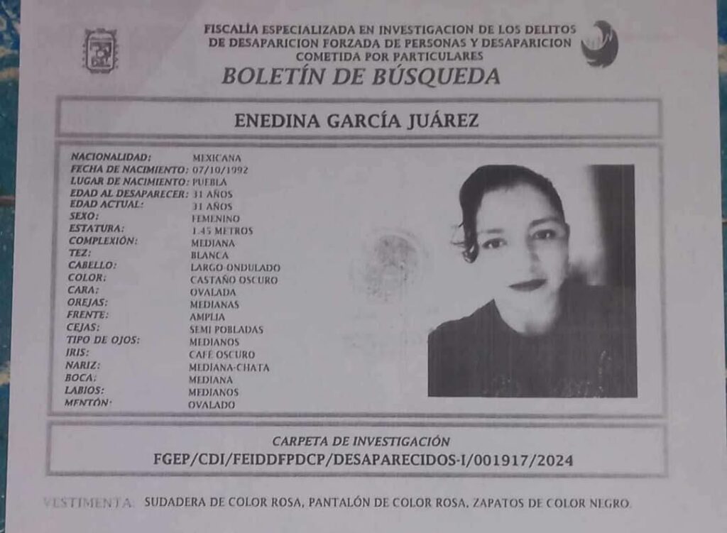 Enedina García Juárez, de 31 años de edad, es la mujer localizada sin vida en el municipio de Chapulco, y que fue reportada como desaparecida desde el pasado 19 de diciembre, en la colonia El Porvenir, de la ciudad de Puebla.