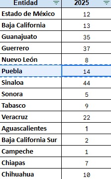 Los primeros cinco lugares los ocupan Sinaloa con 44, Guanajuato con 35, Guerrero con 37, Veracruz con 22 y Michoacán con 29.