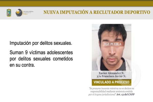 La Fiscalía General del Estado de Puebla (FGE) informó que hay dos nuevas denuncias de abuso sexual en contra del presunto reclutador deportivo del Club Puebla, Xavier Alexander N, quien anteriormente se vinculó a proceso por violación agravada y corrupción de menores.