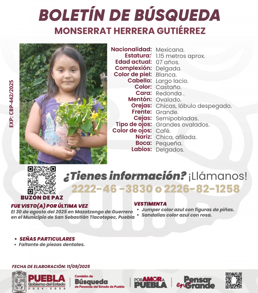 Se cumplen 25 días de búsqueda ininterrumpida de la niña Monserrat Herrera Gutiérrez, de 7 años de edad, arrastrada por el río en la comunidad de Mazatzongo de Guerrero, en el municipio de Tlacotepec de Porfirio Díaz, al sur del estado de Puebla, cuando cuando se metió a nadar durante un paseo familiar.