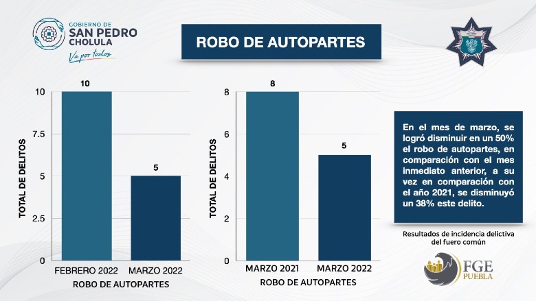 De acuerdo a la información sobre incidencia delictiva del fuero común de la Fiscalía General del Estado de Puebla, en el mes de marzo del 2022 se registró una disminución del 50% en robo de autopartes, en comparación con el mes inmediato anterior, y a su vez en relación al año pasado, se redujo un 38%.