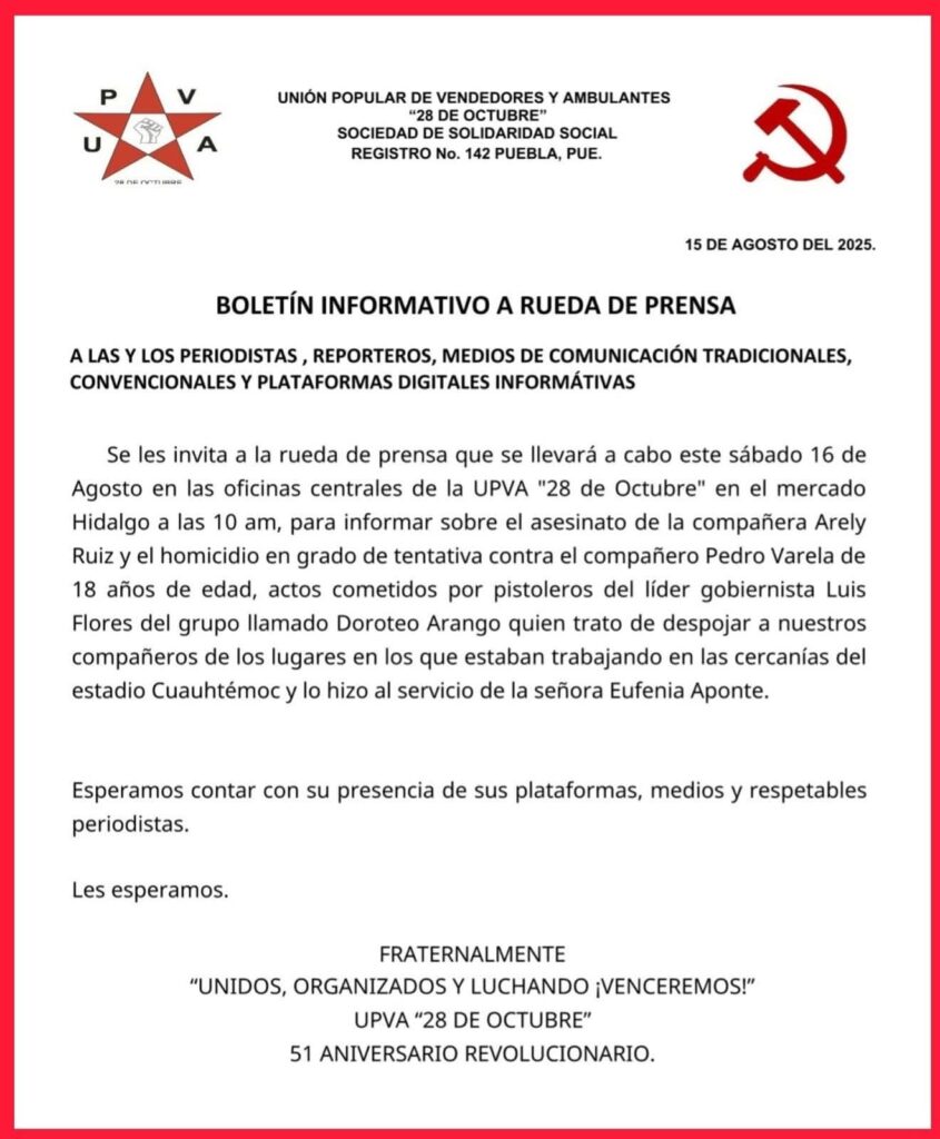 La Unión Popular de Vendedores Ambulantes (UPVA) 28 de Octubre responsabiliza a la organización Doroteo Arango de la balacera registrada frente al Estadio Cuauhtémoc, al norte de la ciudad de Puebla.