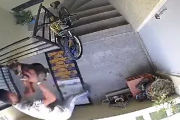 De acuerdo con las imágenes, el sujeto aparentemente intoxicado, se ladea al subir las escaleras y luego al huir, primero toma con las manos al perro, luego lo tira al piso donde lo azota y lo patea, para finalmente lanzarlo desde el segundo piso del edificio.