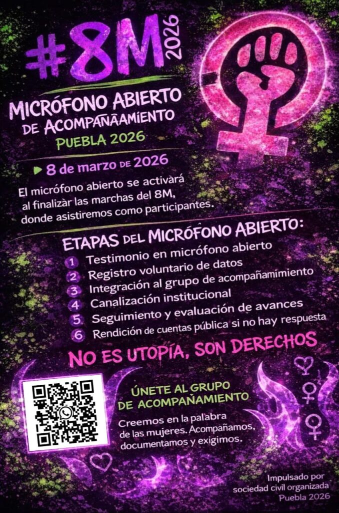 Colectivos y agrupaciones de estudiantes universitarias anunciaron que el próximo 8 de marzo llevarán a cabo el Micrófono abierto de acompañamiento Puebla 2026, el cual tiene como objetivo que los testimonios de víctimas de violencia no se queden únicamente en la denuncia pública.