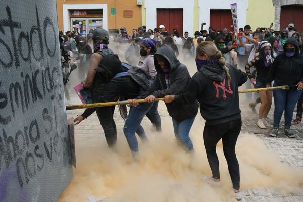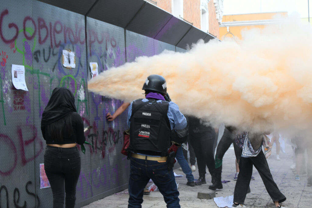 El Gobierno de Tlaxcala usó gas lacrimógeno y un coche cisterna contra la protesta feminista realizada este 8 de marzo cuando las mujeres intentaron derribar el muro de metal que se instaló alrededor del palacio.