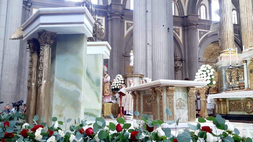 El arzobispo de Puebla, Víctor Sánchez Espinosa consagró el nuevo altar, ambón y cátedra elaborados en Verona, Italia por el taller de arte sacro “Arte Poli”, para la Catedral Angelopolitana.