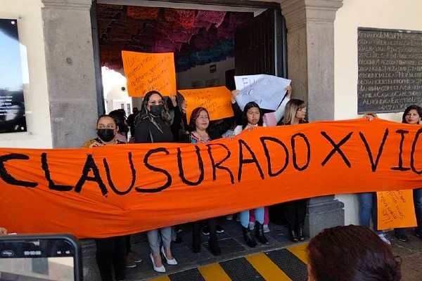 La regidora Beatriz Pérez Fragoso acompañada de un grupo de activistas feministas e integrantes del sindicato “Luis Cabrera”, protestaron contra Paola Angon y clausuraron simbólicamente el Palacio Municipal de San Pedro Cholula.