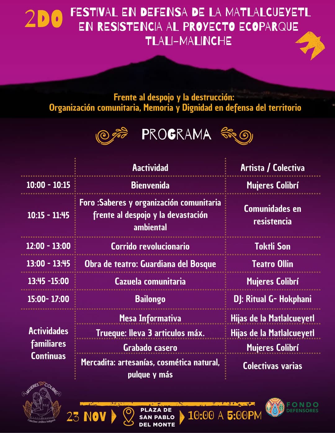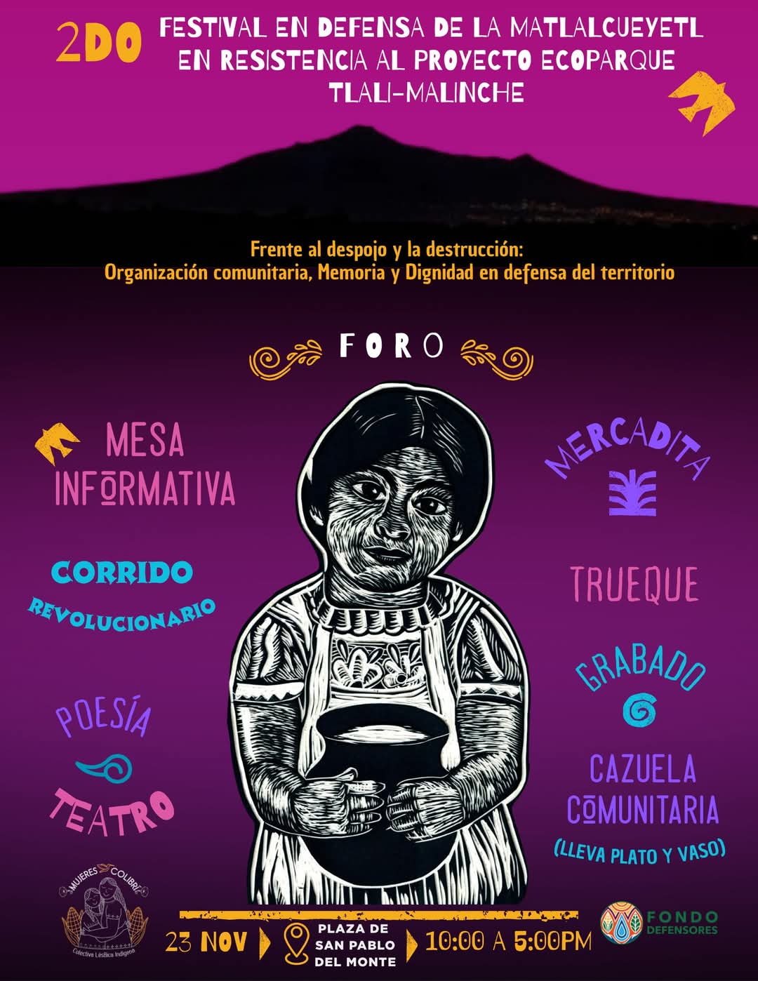 “Con harto fuego en el corazón invitamos a las comunidades hijas de la volcana al 2° Festival por la Defensa de la Matlalcuéyet“, puede leerse en sus redes sociales.
