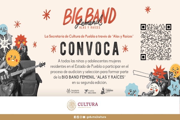 La Secretaría de Cultura invita a niñas y jóvenes saxofonistas, trompetistas, trombonistas, bajistas, guitarristas y bateristas, de entre 10 y 17 años, a participar en la segunda edición de la convocatoria para integrar la Big Band Femenil “Alas y Raíces Puebla”, agrupación dirigida por la saxofonista mexicana Ximena Constantino.