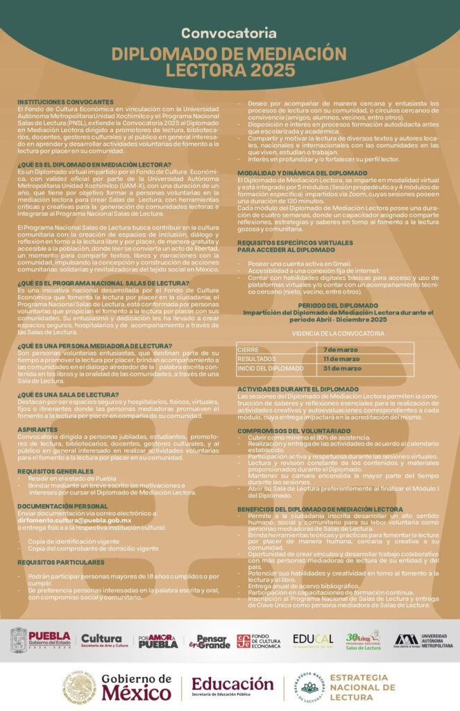 En coordinación con el Fondo de Cultura Económica, el gobierno de Alejandro Armenta, a través de la Secretaría de Arte y Cultura, ofrece de manera gratuita el Diplomado en Mediación Lectora, dirigido a las y los promotores, bibliotecarios, docentes, gestores culturales y público en general interesado en el fomento a la lectura, residentes del estado.