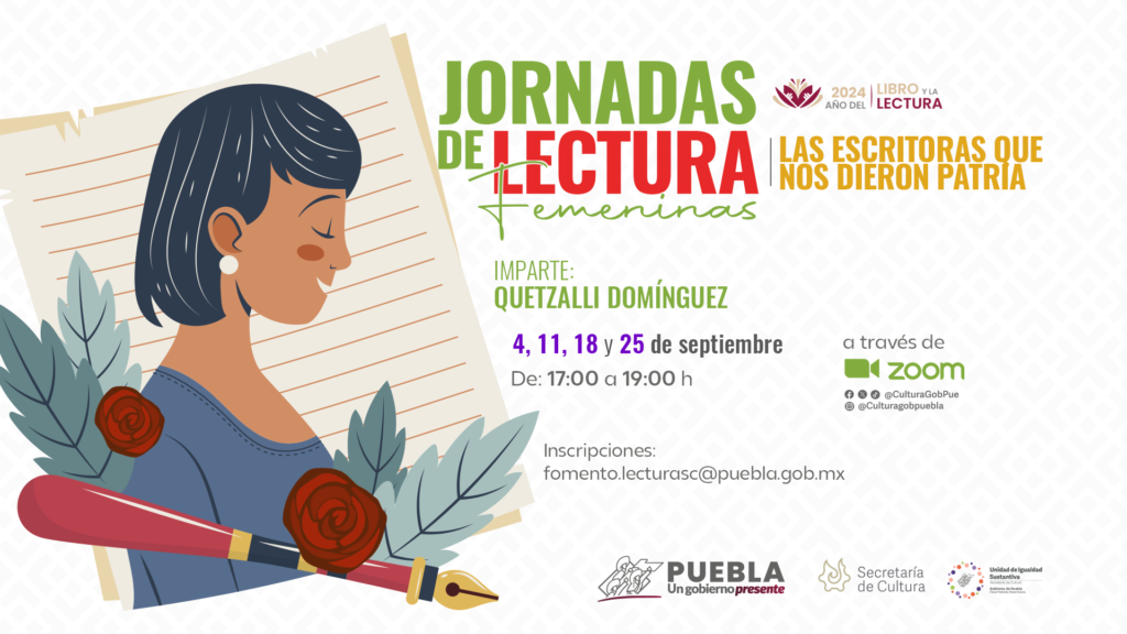 Dentro de las actividades literarias que el gobierno presente de Sergio Salomón desarrolla por motivo del “2024, Año del Libro y la Lectura”, la Secretaría de Cultura llevará a cabo la jornada virtual “Las escritoras que nos dieron patria”, los jueves 04, 11, 18 y 25 de septiembre, de 17:00 a 19:00 horas.