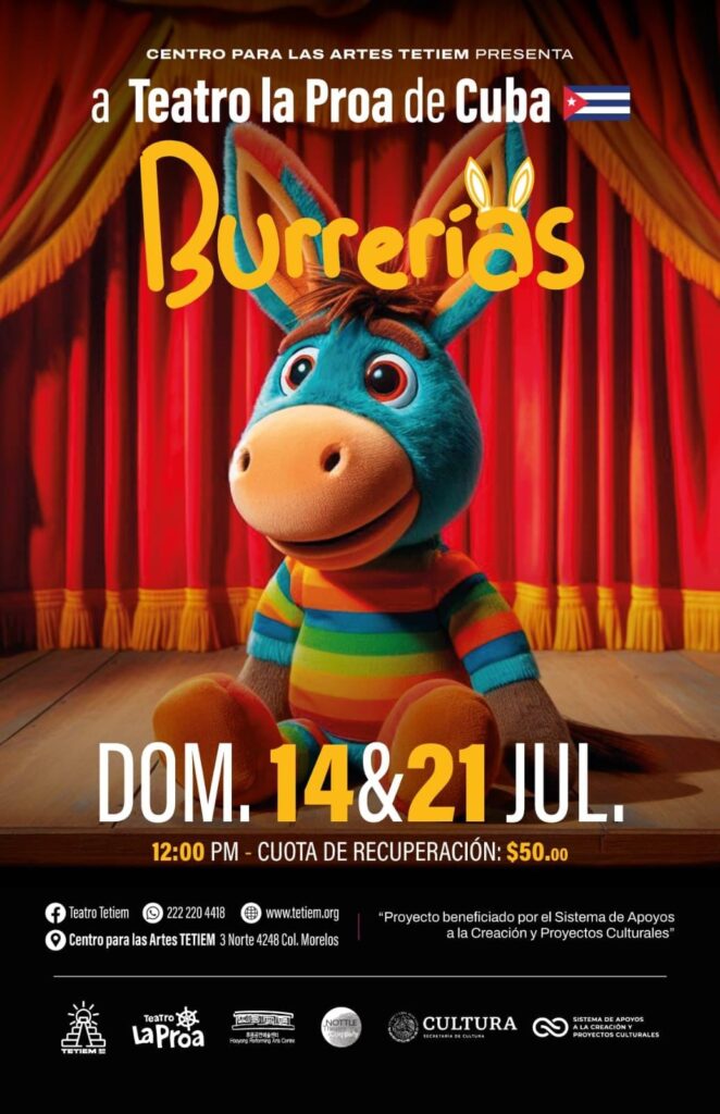 La obra para exhibirse por Teatro de Grupo será “Burrerías”, una fábula con burros, que versa sobre el amor, la felicidad, la ternura y aborrecer el maltrato a lo diferente; se presenta los días 14 y 21 de julio a las 12 horas.