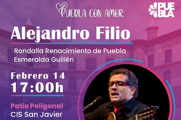 Para celebrar el “Día del amor y la amistad”, la Secretaría de Cultura programó para este 14 de febrero el concierto “Puebla con amor”, en el que participarán los cantautores Alejandro Filio y Esmeralda Guillen, así como la rondalla “Renacimiento de Puebla”.