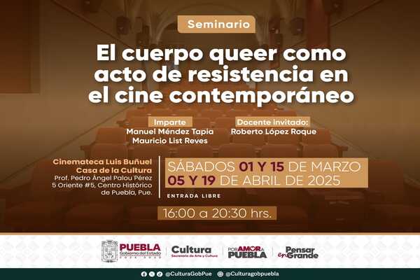 La Secretaría de Arte y Cultura llevará a cabo el seminario internacional “El cuerpo queer como acto de resistencia en el cine contemporáneo. Identidades diversas, espacios y comunidad.”, los sábados 01 y 15 de marzo, y 05 y 19 de abril, de 16:00 a 20:30 horas, en la Cinemateca “Luis Buñuel”.