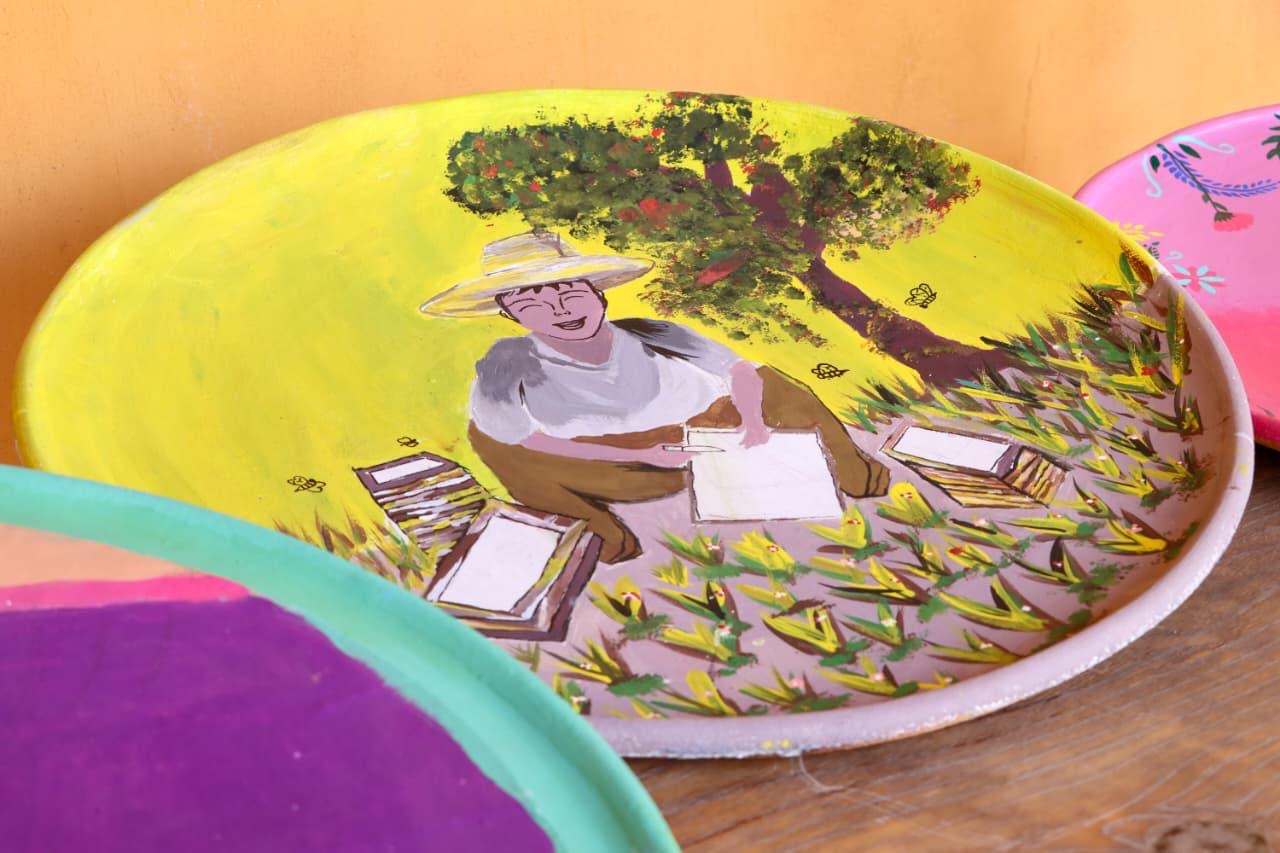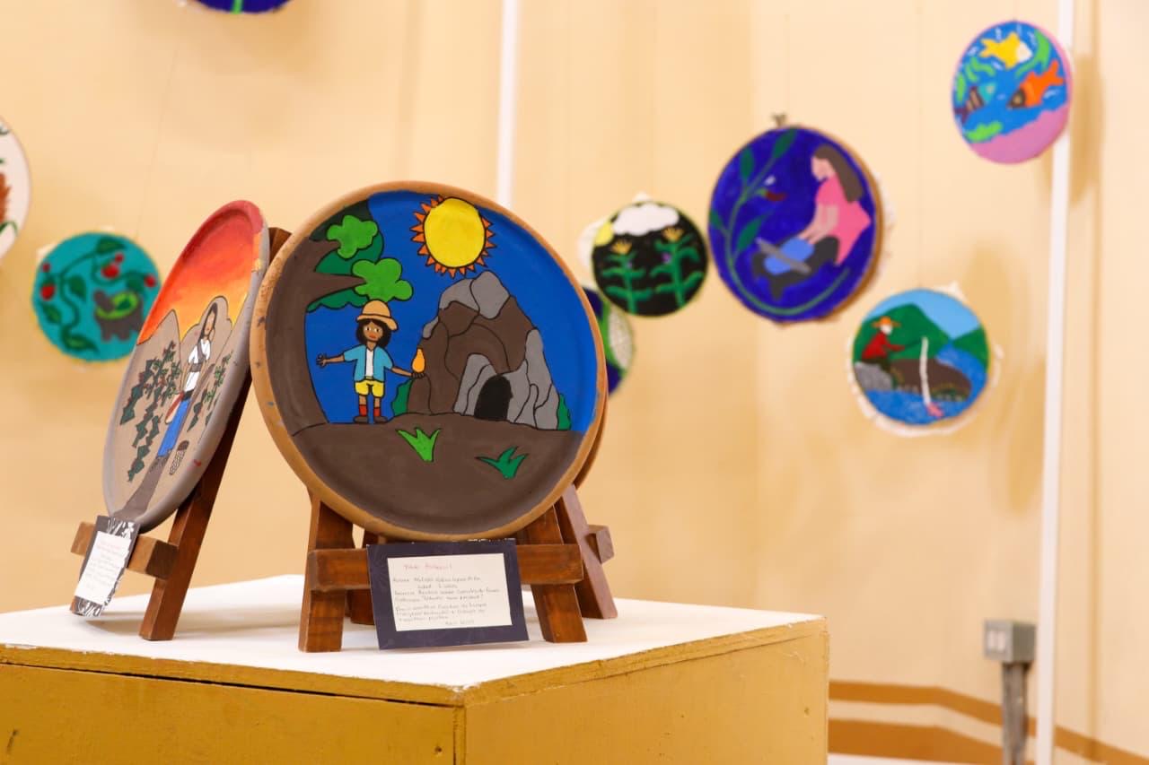 La exposición “Tengo un sueño” se divide en tres secciones: “El círculo que nutre”, en la que las y los autores reflejan parte de su cosmovisión mediante intervenciones pictóricas hechas sobre comales; “Mercado de raíces”, con jícaras, cuentacuentos y casitas de adobe; y “Lluvia de semillas”, conformada por 50 libros de bocetos.