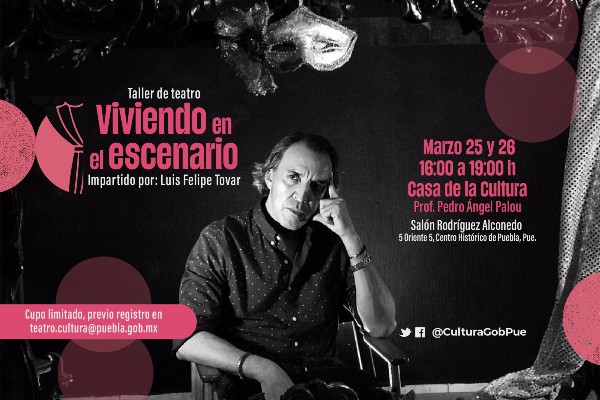 En el marco del Día Mundial del Teatro (27 de marzo), el gobierno de Puebla, a través de la Secretaría de Cultura, ofrecerá el taller de teatro “Viviendo en el escenario”, impartido por el artista mexicano Luis Felipe Tovar, los días sábado 25 y domingo 26 de marzo de 16:00 a 19:00 horas.