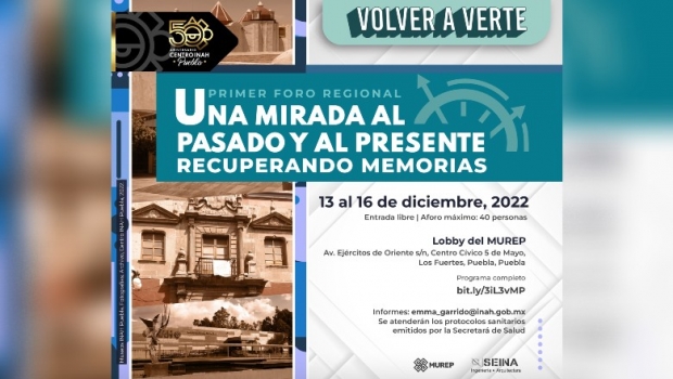 La Secretaría de Cultura y el Centro INAH Puebla a través del Museo Regional de Puebla, realizarán el Primer Foro Regional “Una mirada al pasado y presente, recuperando memorias”, que se realizará de manera presencial del 13 al 16 de diciembre, en la Sala de Exposiciones temporales del Murep, a las 10 horas, en el marco del 50 Aniversario del Centro INAH Puebla.