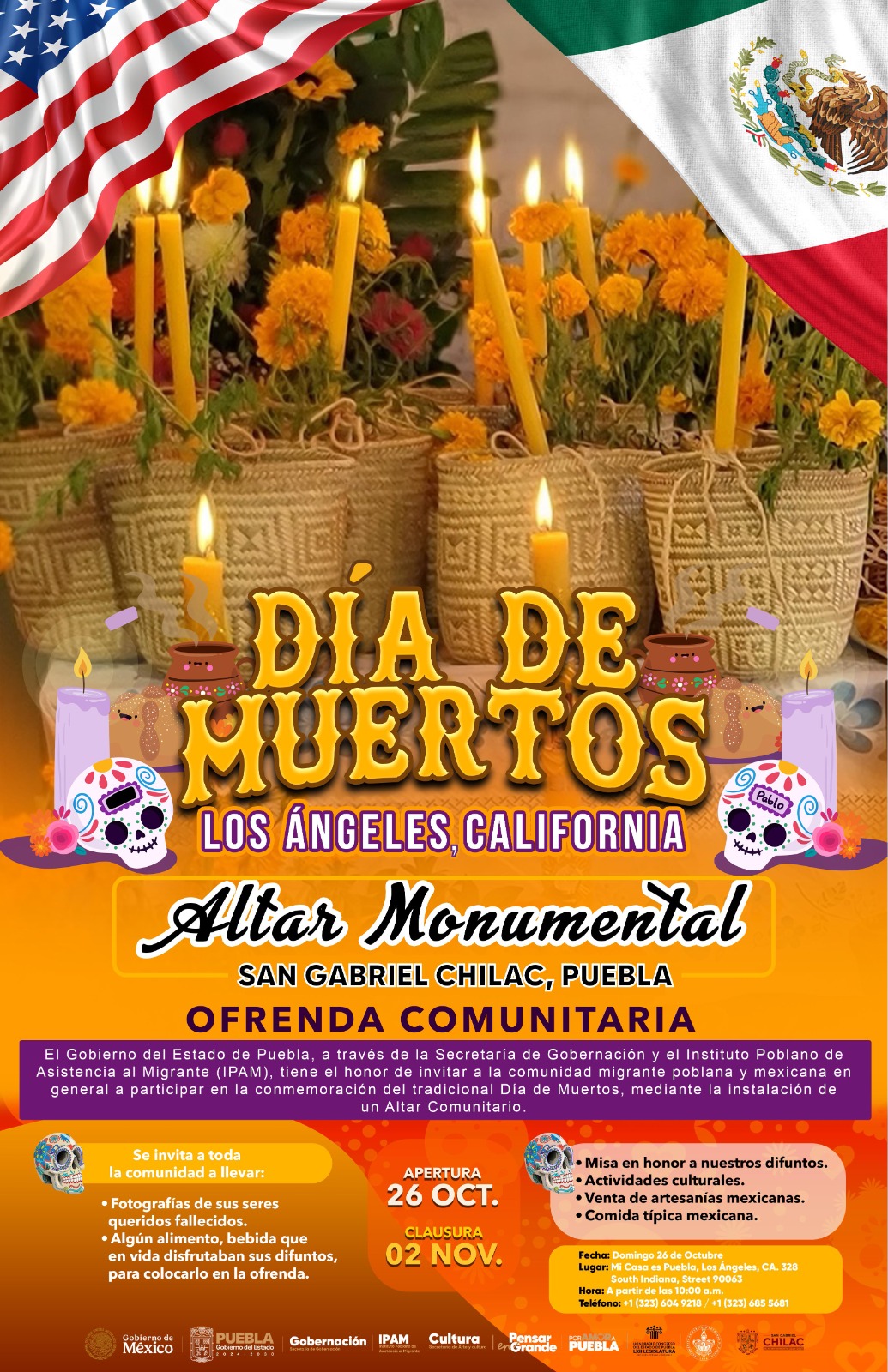 Los altares serán colocados en las oficinas de “Mi Casa es Puebla” en Los Ángeles, California y en Passaic, Nueva Jersey, por lo que el gobierno estatal convoca a todas y todos los connacionales mexicanos que radican en dichas zonas, a participar con una fotografía de sus seres queridos fallecidos y algún alimento o bebida que en vida disfrutaron, para ser colocados en la ofrenda.