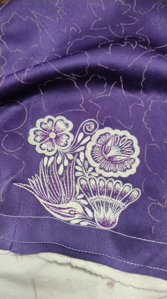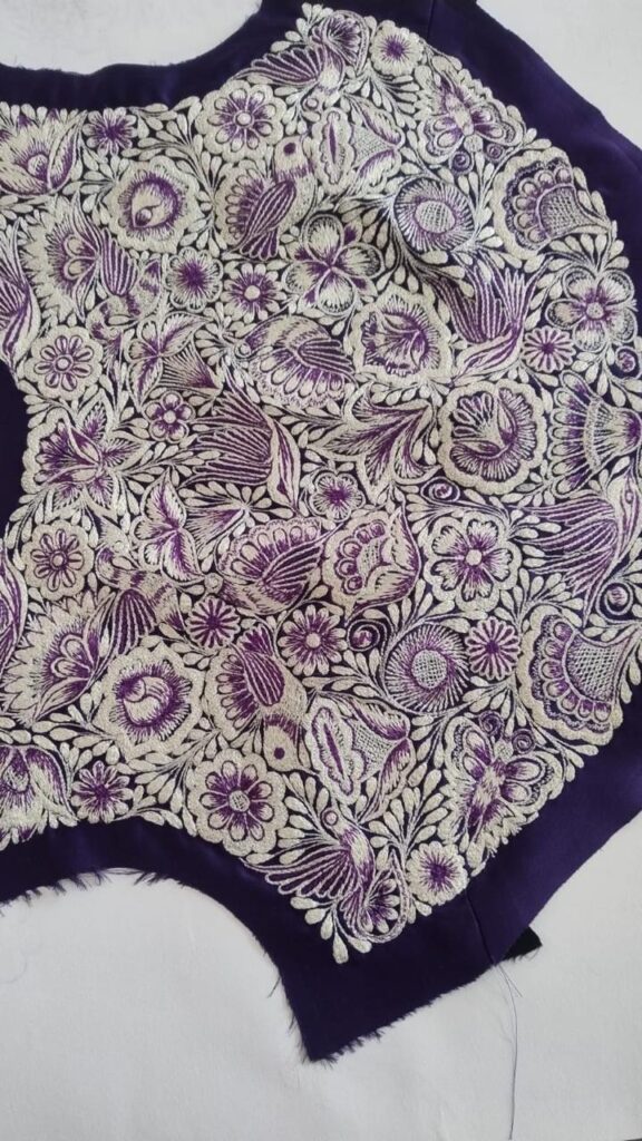 Virginia Arce agregó que la tela elegida fue un tono morado, con bordados en gris y destellos púrpura. El diseño plasmó la flora y fauna de la región, inspirados en el entorno natural de la Malinche.