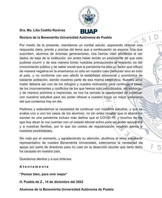 “Los que suscriben, alumnos de diversas generaciones, nos hemos visto afectados al haber sido dados de baja de la institución, sin antes haber tenido un precedente de que esto pudiese ocurrir y de esta manera tomar nuestras precauciones al respecto”, señalaron en un comunicado alumnos de distintas generaciones.