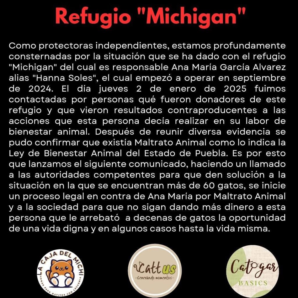El refugio denominado “Michigan” había sido presentado por su responsable, Ana María García Álvarez, conocida en redes sociales como “Hanna Soles”, como un espacio dedicado al rescate y cuidado de animales en situación de abandono.