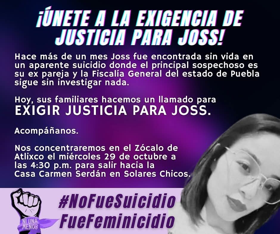 La Red Feminista de Atlixco convocó a la ciudadanía a manifestarse el próximo miércoles 29 de octubre para exigir a la Fiscalía General del Estado (FGE) que investigue el caso de Joss, hallada sin vida a mediados de septiembre de este año.