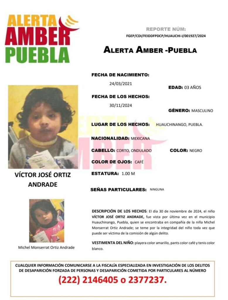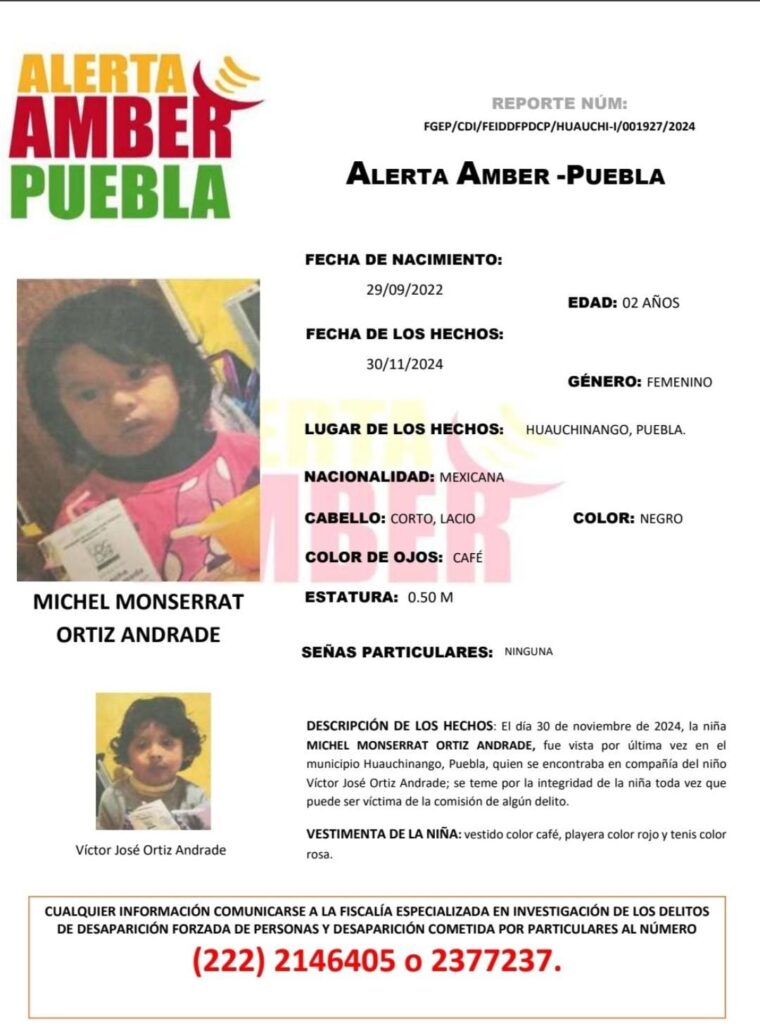 El sistema de búsqueda y monitoreo de personas desaparecidas Alerta Amber Puebla solicitó el apoyo para la localización inmediata de los menores Michel Monserrat y Víctor José Ortiz Andrade, de dos y tres años de edad, respectivamente.