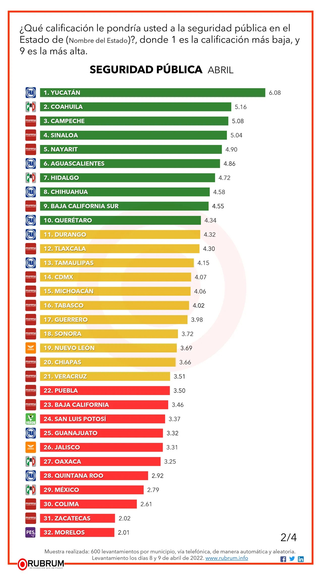 De acuerdo a la encuesta Rubrum, el mejor desempeño lo tienen los gobiernos de: Yucatán, Chihuahua, Sinaloa, Nuevo León, San Luis Potosí, Guerrero, Nayarit, Aguascalientes, Coahuila y Michoacán.