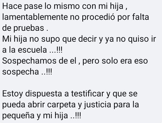 También acudirá otra madre de familia que solicitará que la FGE abra otro expediente, pues hace 6 años denunció un caso similar ocurrido en esa misma escuela, en dónde Mario Joaquín Conde presta sus servicios como intendente desde hace 25 años.