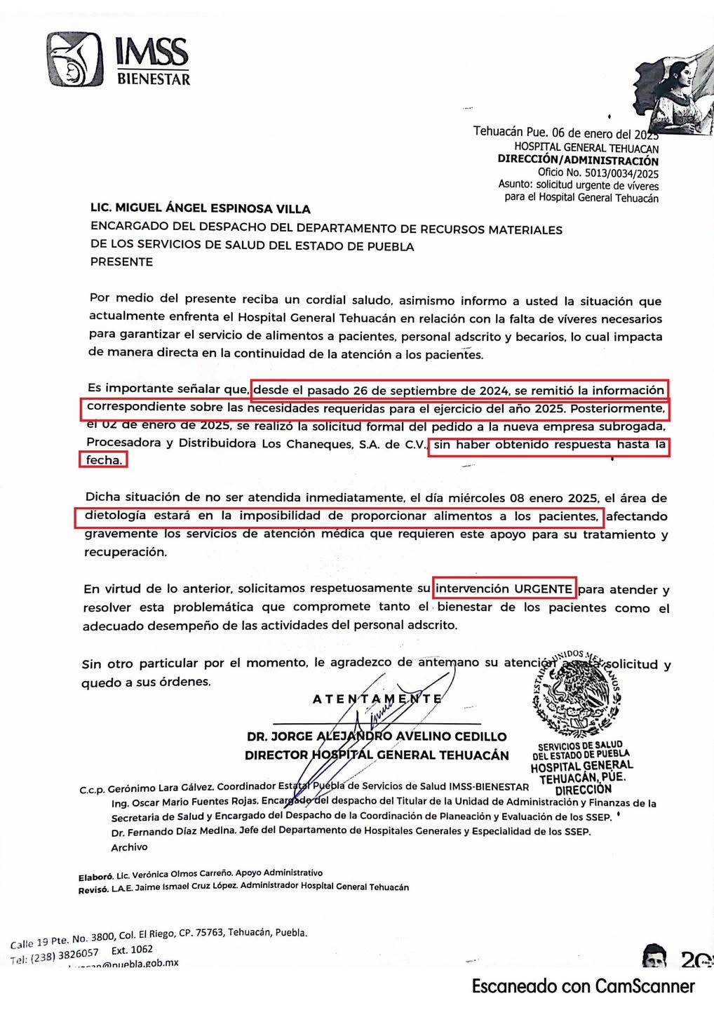 Ante la inminente imposibilidad de proporcionar alimentos a partir del 8 de enero, el director del hospital, Dr. Jorge Alejandro Avelino Cedillo, ha solicitado la intervención urgente del Departamento de Recursos Materiales de los Servicios de Salud del Estado de Puebla para resolver la situación. De no solucionarse, se verán gravemente afectados los servicios de atención médica esenciales para la recuperación de los pacientes.