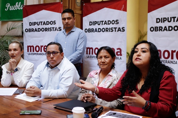 PUEBLA, Pue. 22 Marzo 2023.- Los legisladores de MORENA Daniela Mier, Iván Herrera, Carlos Evangelista, Yolanda Gámez y Angélica Cervantes durante conferencia de prensa. . // Pablo Spencer/Agencia Enfoque //