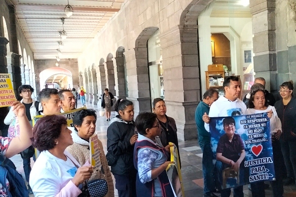 Luego de eso, Teresa y demás voceadores se plantaron frente a Palacio Municipal para entregar sus peticiones a la Comuna. Los manifestantes exhibieron pancartas con la foto de Santiago, mientras la señora entró a dialogar con algunos servidores públicos.