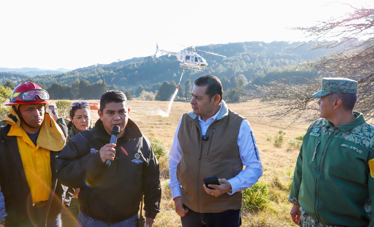 Desde el aire, el mandatario constató las acciones estratégicas que permitan contener y extinguir el fuego a la brevedad, las cuales son ejecutadas por elementos de Protección Civil del Estado, Policía Forestal, Comisión Nacional Forestal (CONAFOR) y la Brigada Coyote 7.