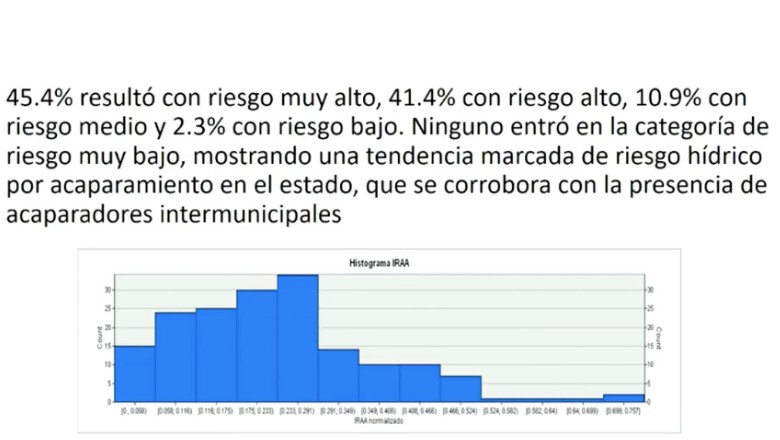 Ahí, la investigadora explicó que el IRAA se logra a partir de ubicar en qué municipios está cada concesión de aguas y el uso para el que se acapara. Como resultado, se determinó que la mayor presión hídrica se tiene actualmente en la zona centro y poniente del estado.