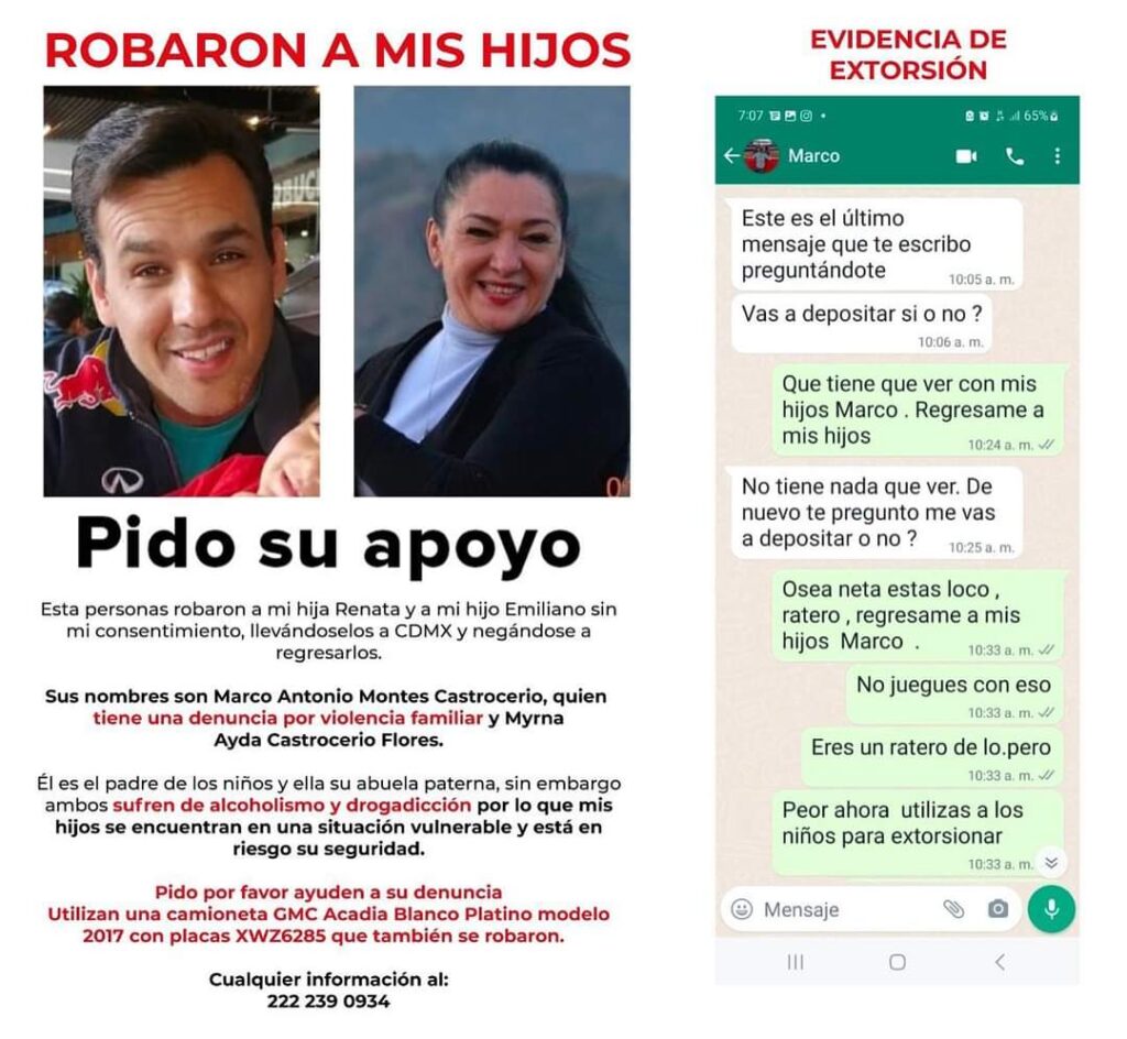 Marco Antonio Montes Castrocerio es acusado por su ex pareja Karla Ortiz de sustracción de sus hijos Renata y Emiliano( de 4 y 6 años respectivamente) y de amenazarla de muerte si no baja de sus redes sociales sus publicaciones donde solicita ayuda.