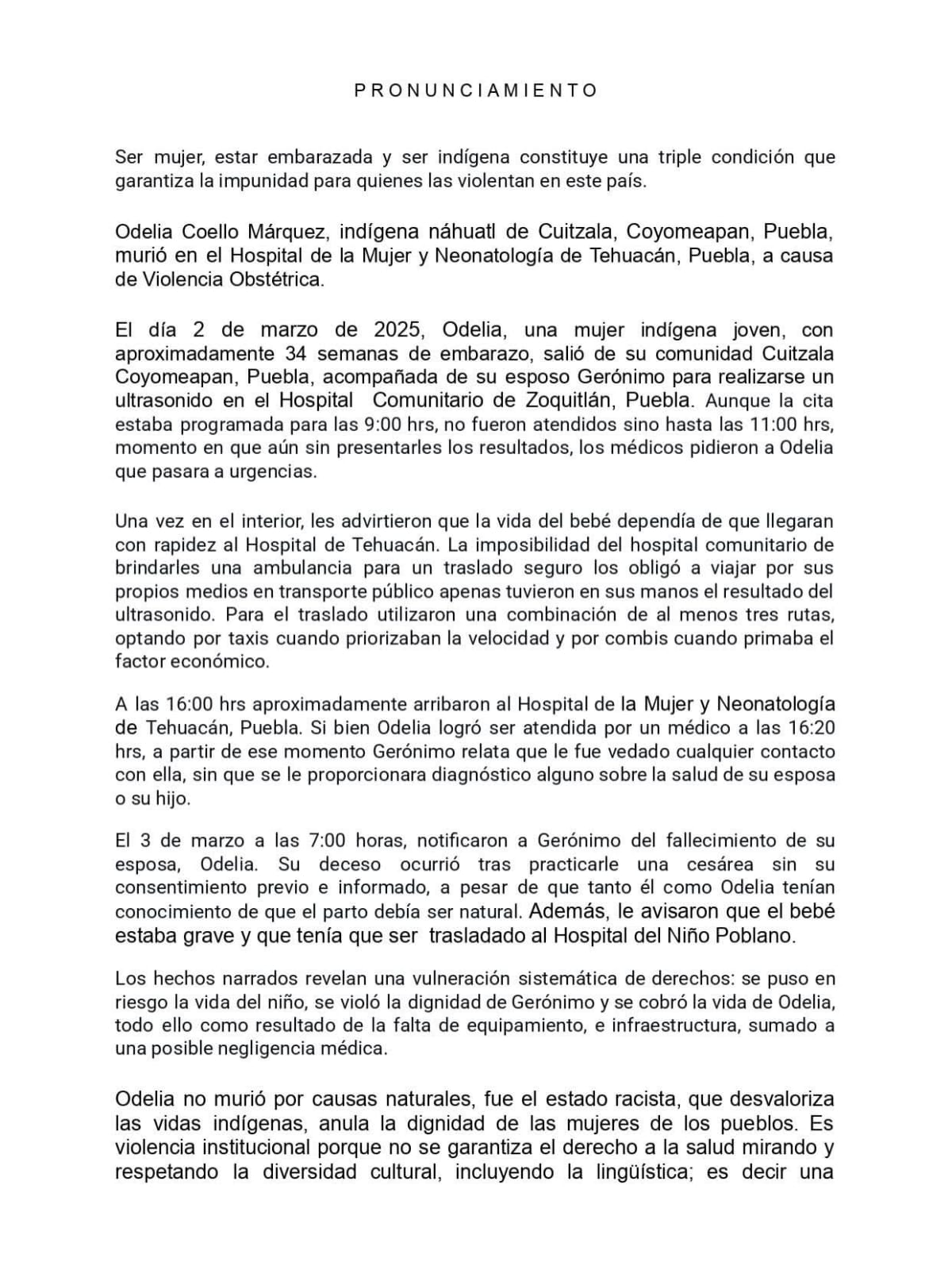 Más de 20 organizaciones de todo el país, entre ellas, Mujeres por el Derecho al Cuidado y una Vida Libre de Violencia y la Red de Abogadas Indígenas, pidieron a la Comisión Nacional de Derechos Humanos (CNDH) atraer el caso de Odelia Coello Márquez, mujer indígena de Coyomeapan, que murió en el Hospital de la Mujer y Neonatología de Tehuacán a causa de una posible violencia obstétrica.