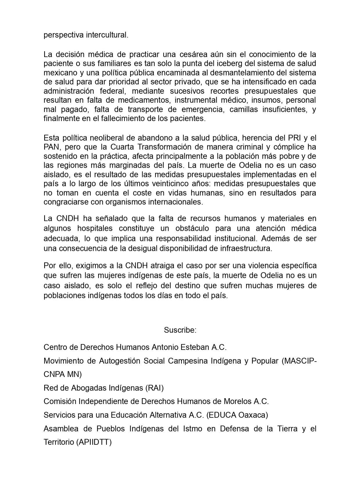 En ese sentido, las agrupaciones que exigen la intervención de la CNDH acusaron que Odelia murió por una posible negligencia médica y violencia institucional.