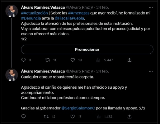 Álvaro Ramírez Velasco promovió una denuncia penal ante la Fiscalía General del Estado (FGE), tras recibir amenazas el pasado jueves.