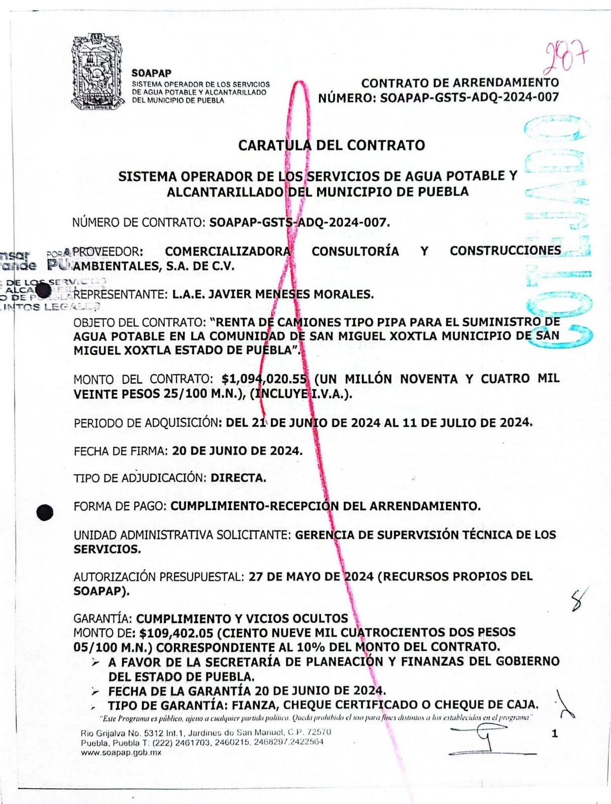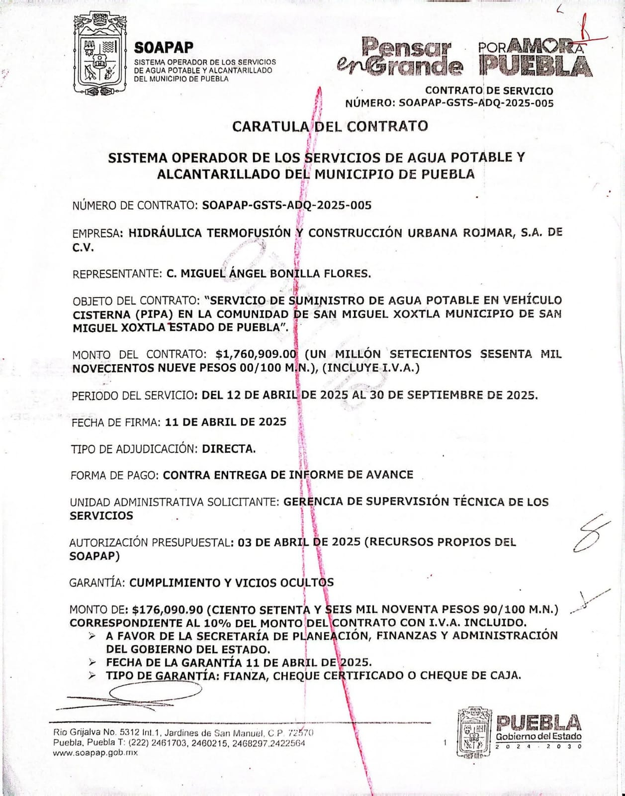 En ese sentido, los comités exhibieron un contrato firmado en 2024 por el Soapap para distribuir agua potable en San Miguel Xoxtla, esto del 21 de junio al 11 de julio, es decir, en un periodo de tres semanas.