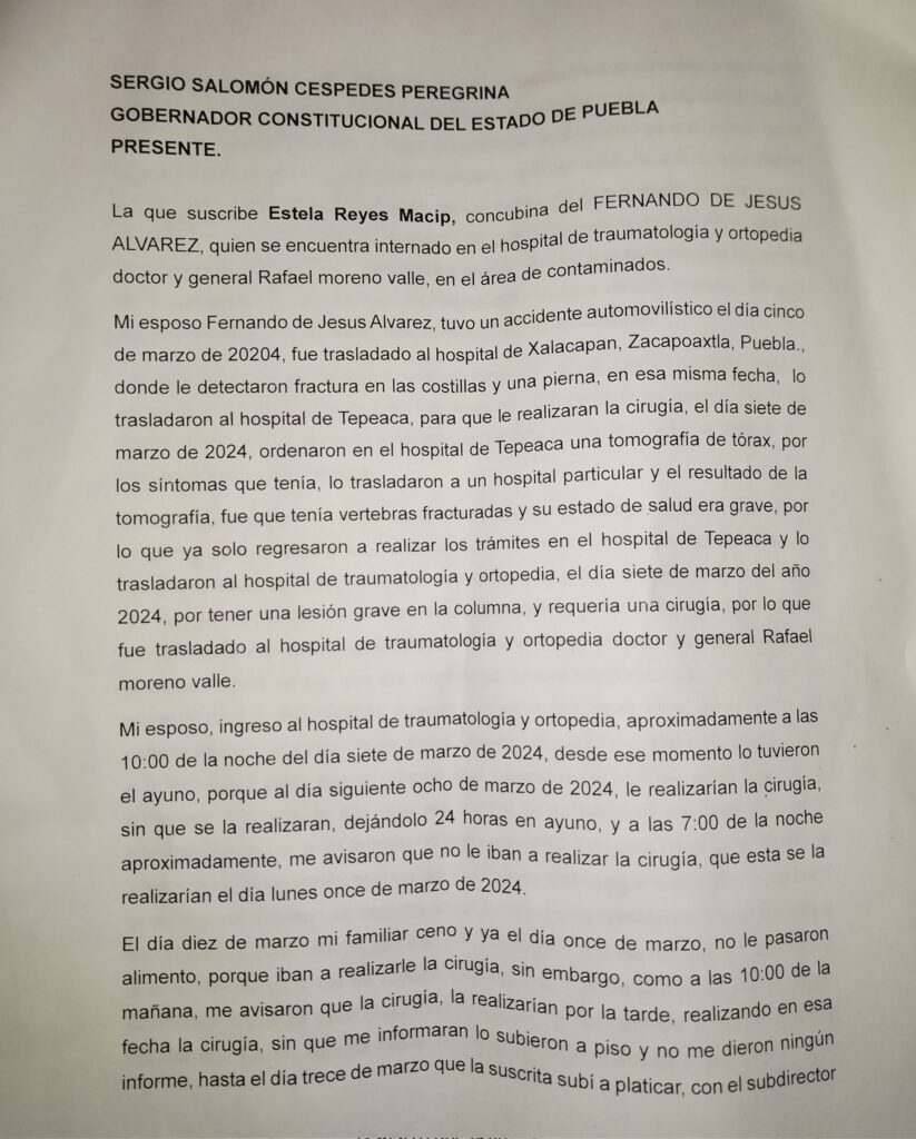 La poblana Ausencia de Jesús Álvarez, originaria de Zacapoaxtla, ha denunciado irregularidades en la atención que recibió su hermano Fernando por una cirugía cervical tras un accidente que sufrió.