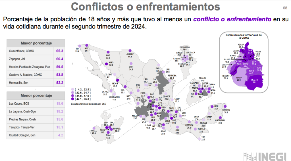 La ENSU elaborada por el Instituto Nacional de Estadística y Geografía (INEGI) estableció un promedio nacional de 36.7% de incidencia de enfrentamientos o conflictos, cifra que es inferior al porcentaje de casos registrados en la capital poblana. El estado de Tlaxcala, por ejemplo, se ubicó por debajo del promedio nacional con una prevalencia de 34.7%.