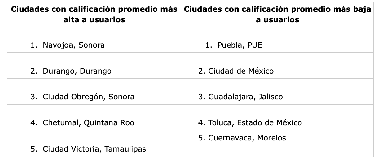 La lista la completan: Los Mochis, La Paz y Hermosillo y Cancún, para las ciudades con mejores calificaciones de usuarios; y León, Cuautla, Tijuana, SLP y Celaya con las calificaciones más bajas.