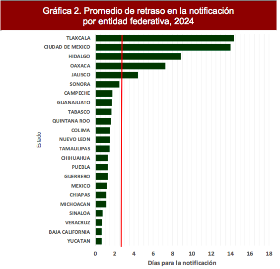 Por otro lado, Tlaxcala destaca en el informe por ser la entidad con el mayor atraso de tiempo para notificar a la secretaría de salud federal sobre las muertes maternas, ya que tarda hasta 15 días para enviar los reportes cuando el promedio nacional del flujo de información es de dos días.