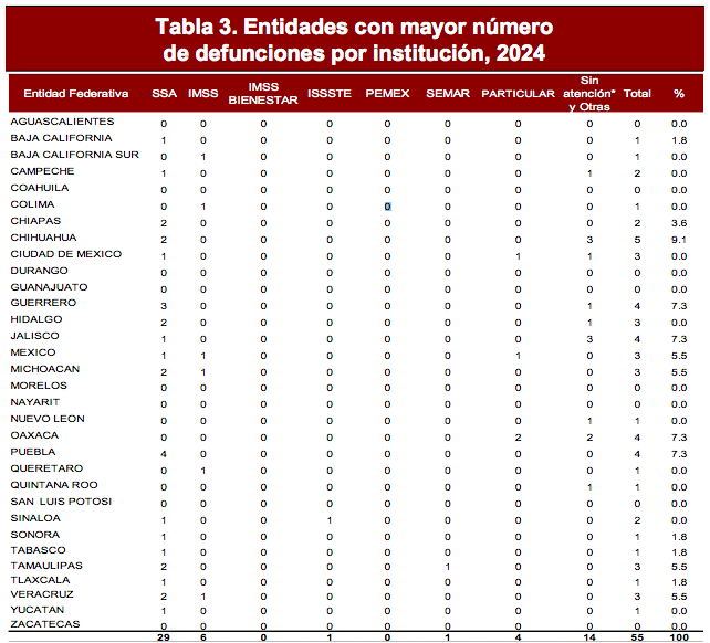 Los estados con más casos de muertes materna en el país son: Chihuahua con cinco reportes, seguido de Guerrero, Jalisco y Oaxaca con cuatro muertes, cada una. Estas entidades, junto con Puebla, concentran el 35 por ciento del total de muertes maternas en México.