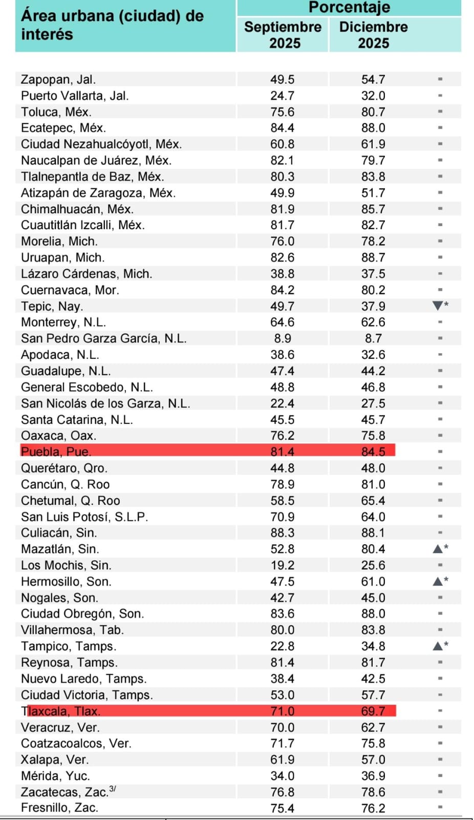En esta edición de la ENSU, 14 áreas urbanas de interés presentaron cambios estadísticamente significativos frente a septiembre de 2025: siete con reducciones y siete con incrementos.