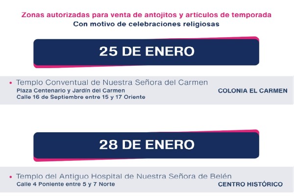 Por motivo de las celebraciones patronales que se realizarán este miércoles 25 y sábado 28 de enero, la Secretaría de Gobernación del Municipio de Puebla permitirá la venta de antojitos y artículos de temporada en inmediaciones del Templo de Nuestra Señora del Carmen y del Templo de Nuestra Señora de Belén, respectivamente.