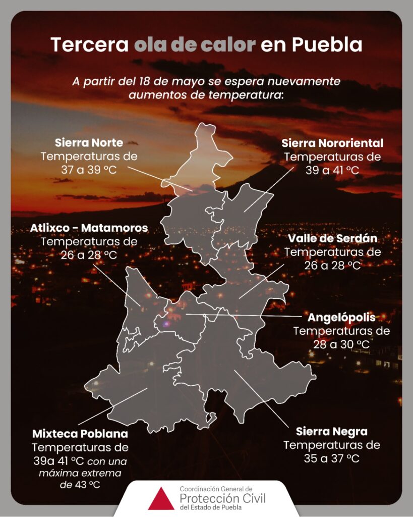 La tercera ola de calor en Puebla inicia el próximo 18 de mayo con temperaturas máximas de entre 35 a 45 grados Celsius, alertó el coordinador de Protección Civil del Estado, Catarino Miranda.