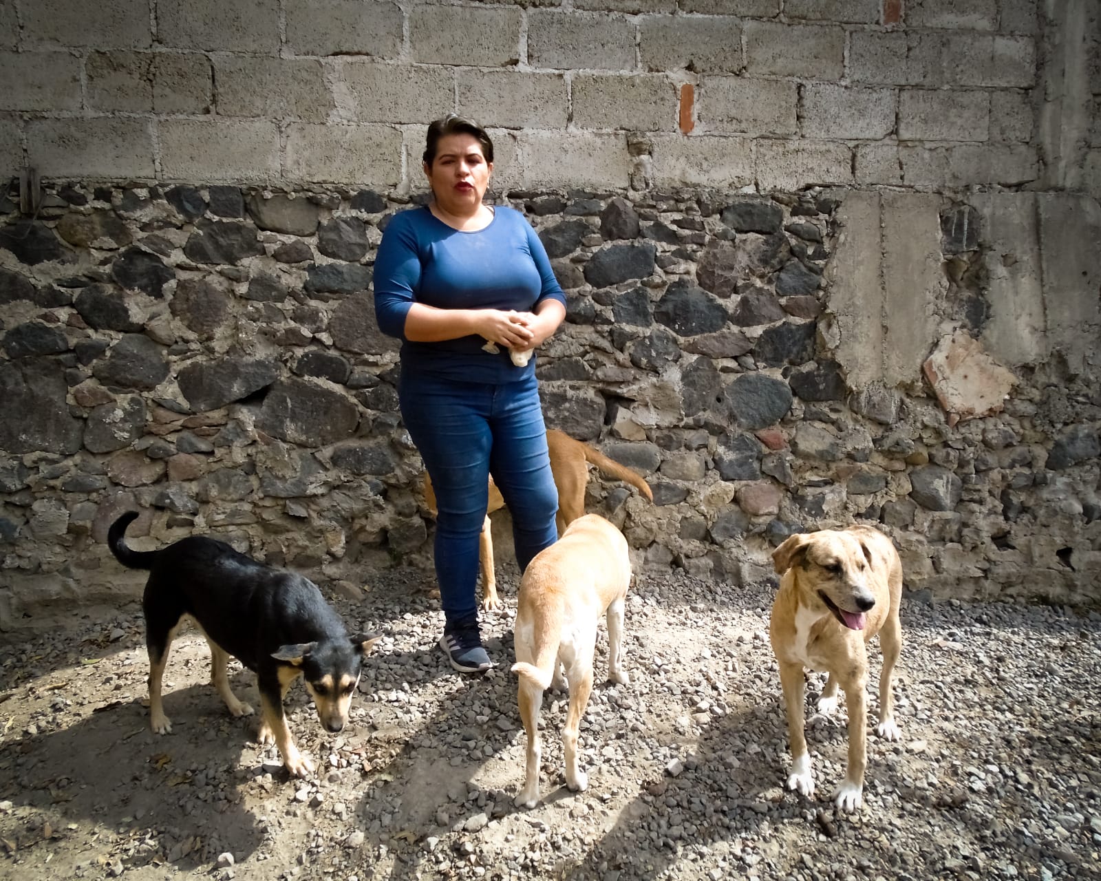 Raquel les habla con tanta dulzura que los perros la siguen hipnotizados, saben que los nombrará uno por uno y les dará una carnaza. Inició con Mimí, a quien rescató hace un año a pie de carretera junto con otros dos cachorros que de inmediato fueron adoptados por ser machos.